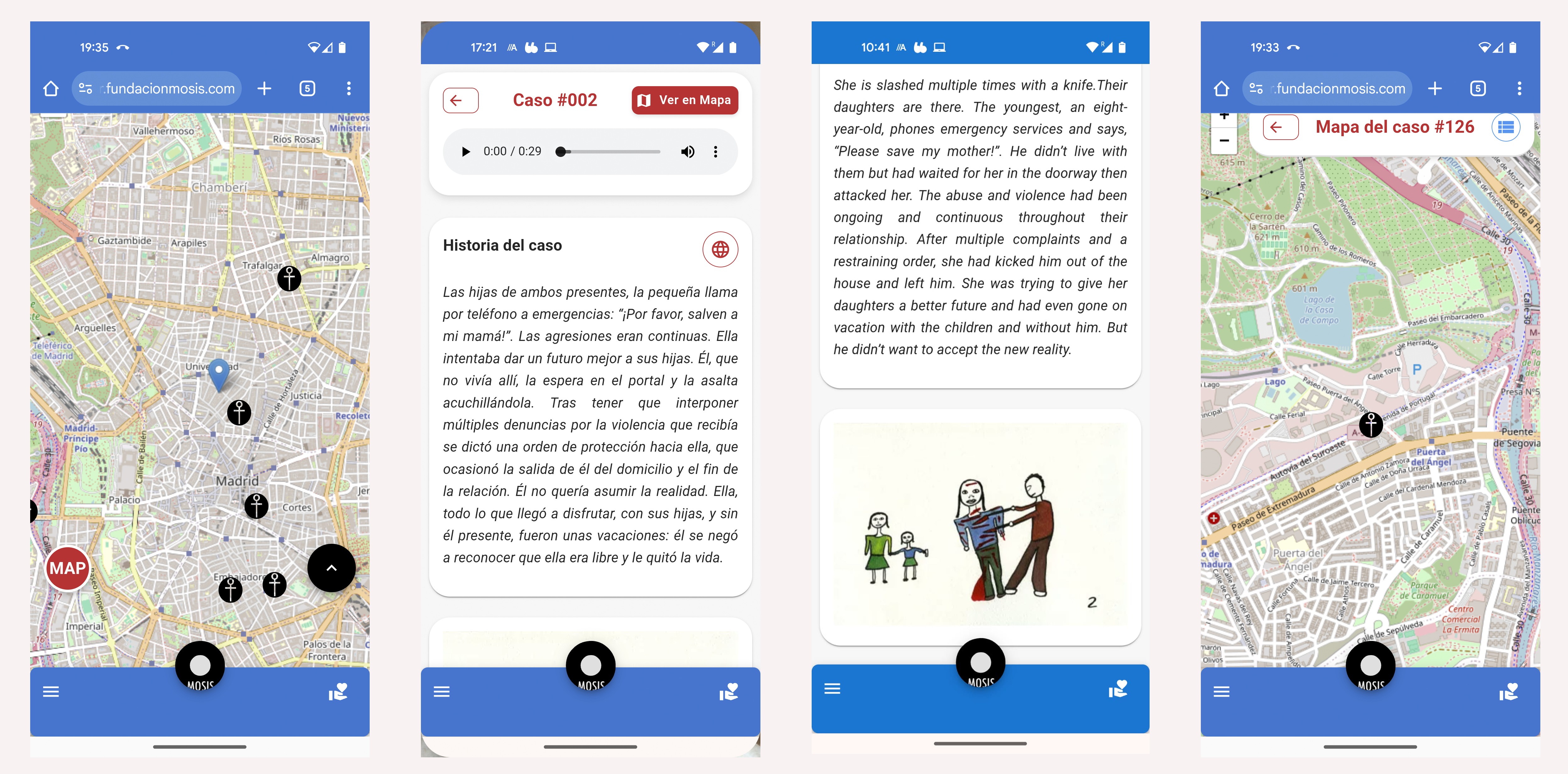 El App se puede visitar como mapa y como lista; cuando se pincha un caso, este lleva a una página con un audio, un dibujo y un texto, este último con posibilidad de traducción al inglés. Cuando se pincha en “como llegar” se abre un nuevo mapa que localiza el caso en el mapa. A la izquierda abajo, te parece una punta de flecha, cuando tienes las Notificaciones, y los Casos Cercas, y GPS ON, (en verde), te enviará un aviso diciendo los casos cerca de tu localización.