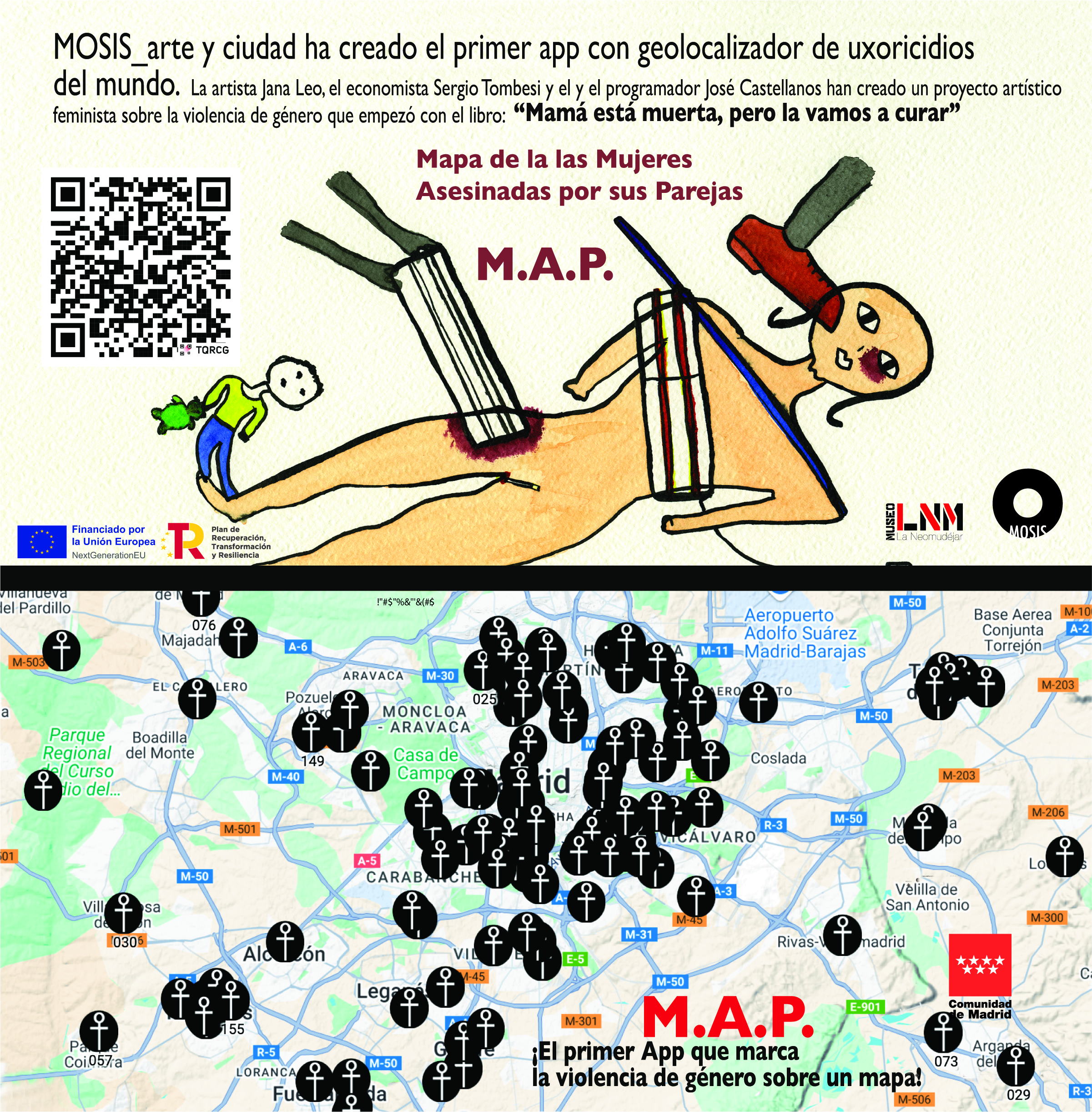Este proyecto se desarrolla en tres años: 2024-2025 y 2026. Ha habido 2 hitos: La asistencia a un programa de acompañamiento y junto a este, primero, la publicación de un libro y segundo la creación de un App de arte urbano ambos son objetos culturales que facilitan la comprensión de un archivo ilustrado de contienen el material digitalizado. Antes de llegar hasta aquí, durante más de 5 años, la artista Jana Leo ha investigado y documentado -junto con el economista Sergio Tombesi- y la asistencia del equipo de MOSIS, todas las muertes por violencia de género ocurridas durante 20 años (1999-2020) en la Comunidad de Madrid. A esta investigación se le dio formato libro y ahora App. Hubo 132 fallecidas por violencia de género que la autora de Violación Nueva York (Malpaso, 2017) se propuso visibilizar a través de sus dibujos, humanizando las estadísticas.